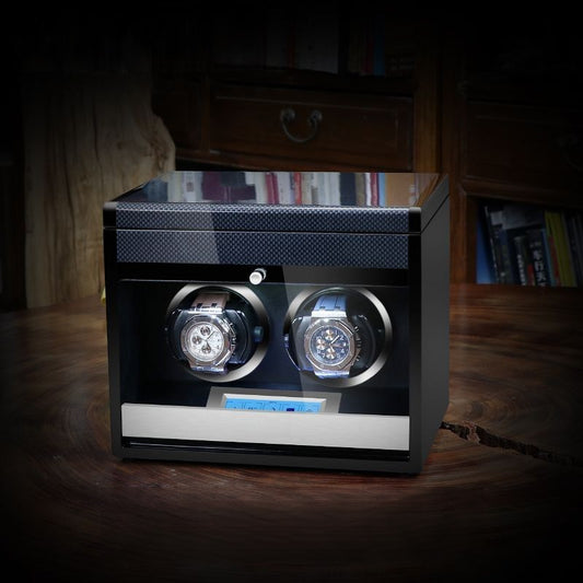 A carbon fiber watch winder is a device used to keep automatic or self-winding watches wound and running when not being worn. It is made with a carbon fiber exterior, which is a lightweight yet strong and durable material.