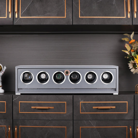 Fingerprint Lock Mechanical 6 Watch Winder Box- Silver